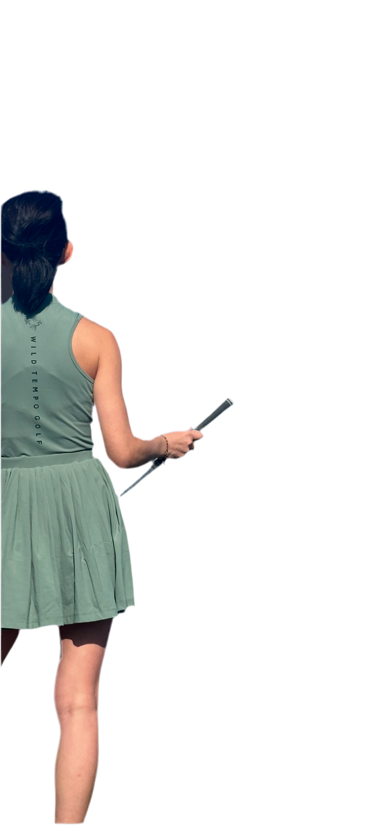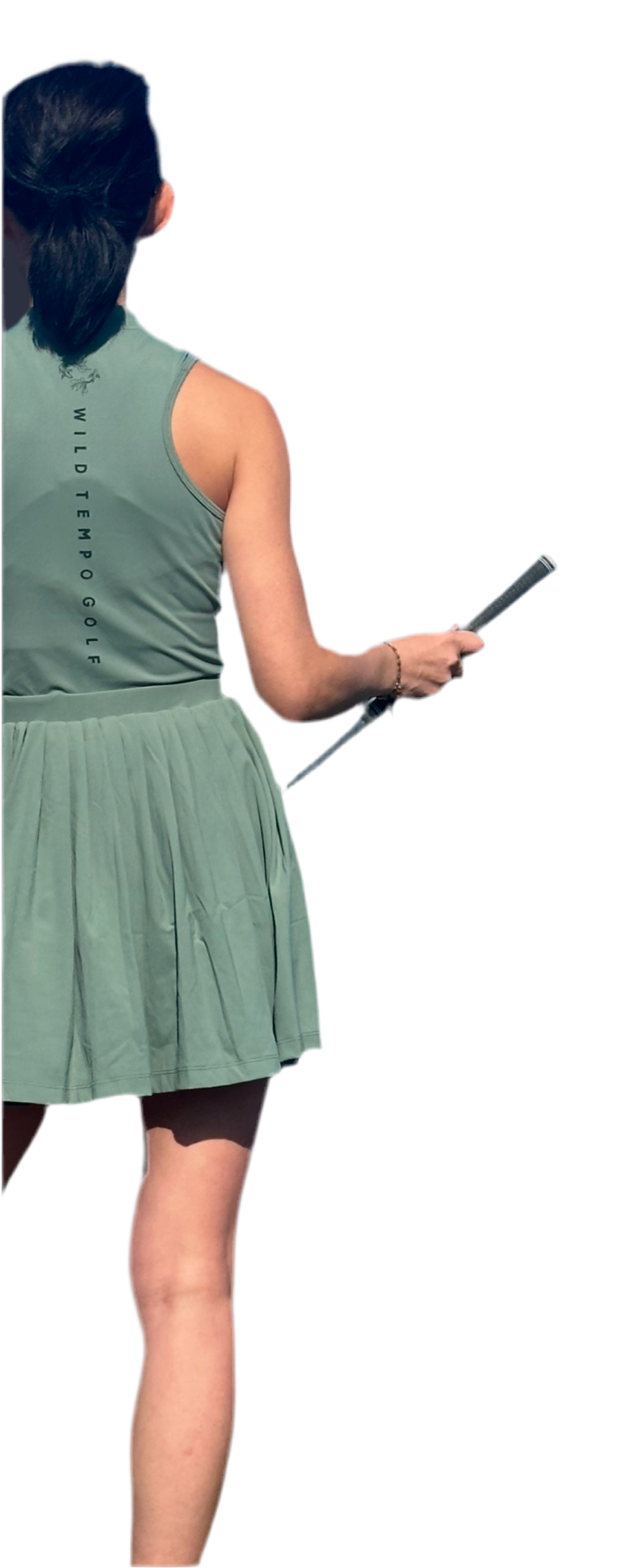 Mock neck, zipper front athletic dress with a pleated skirt. Featuring a open back detail.