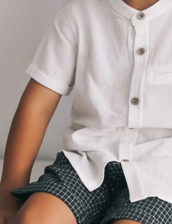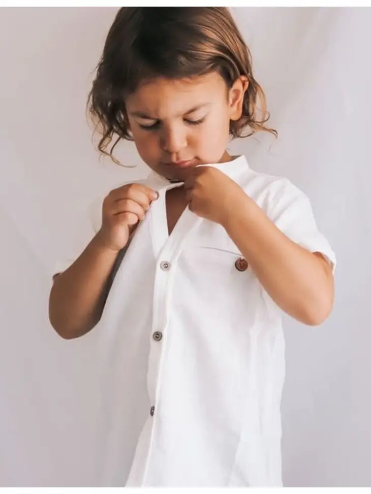Minimalistic is in! Let us introduce you to our Koa Linen Blend Shirt. This boys shirt is ideal for both dressing up and wearing down because it is made of a breathable linen blend. The flexible, lightweight material retains its structured, tidy design while allowing for freedom of movement. Our Koa Boy's Linen Boys Shirt is a must-have for any boy's wardrobe because it has an on-trend Mao collar and wooden buttons that make it simple to dress up or down.