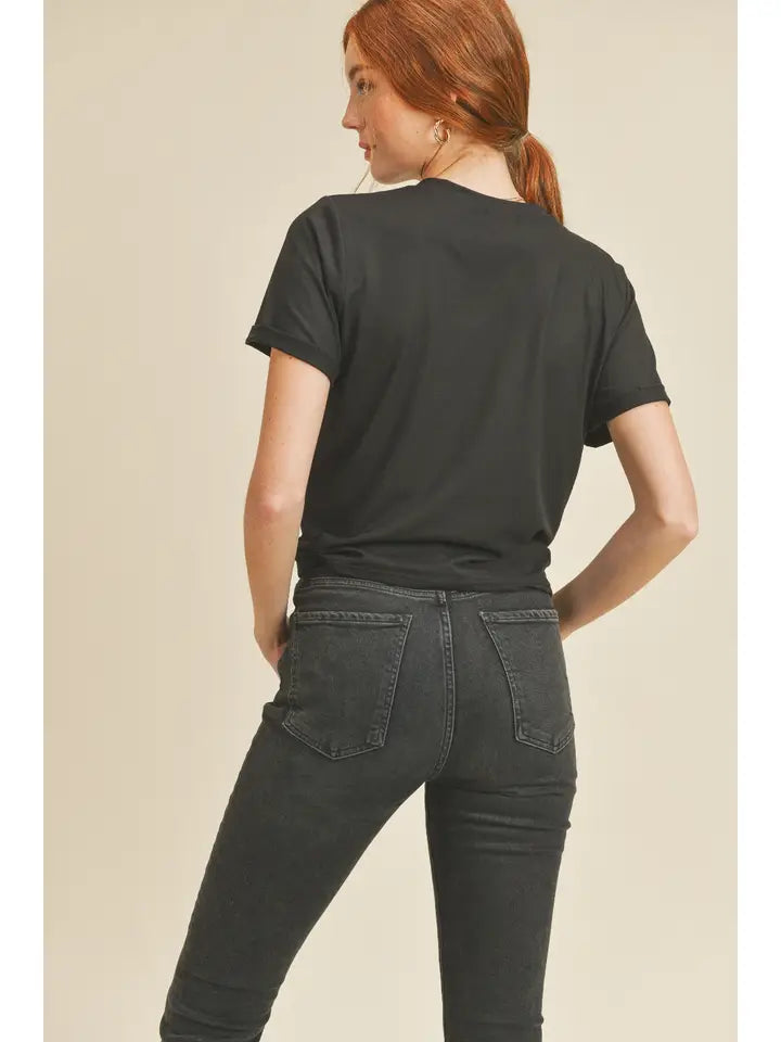 Made in USA - Short sleeves - Crew neck - Twisted front knot - The front is a little shorter than the back - If it's worn with a mom jean it doesn't show the belly button - Model is wearing a size S