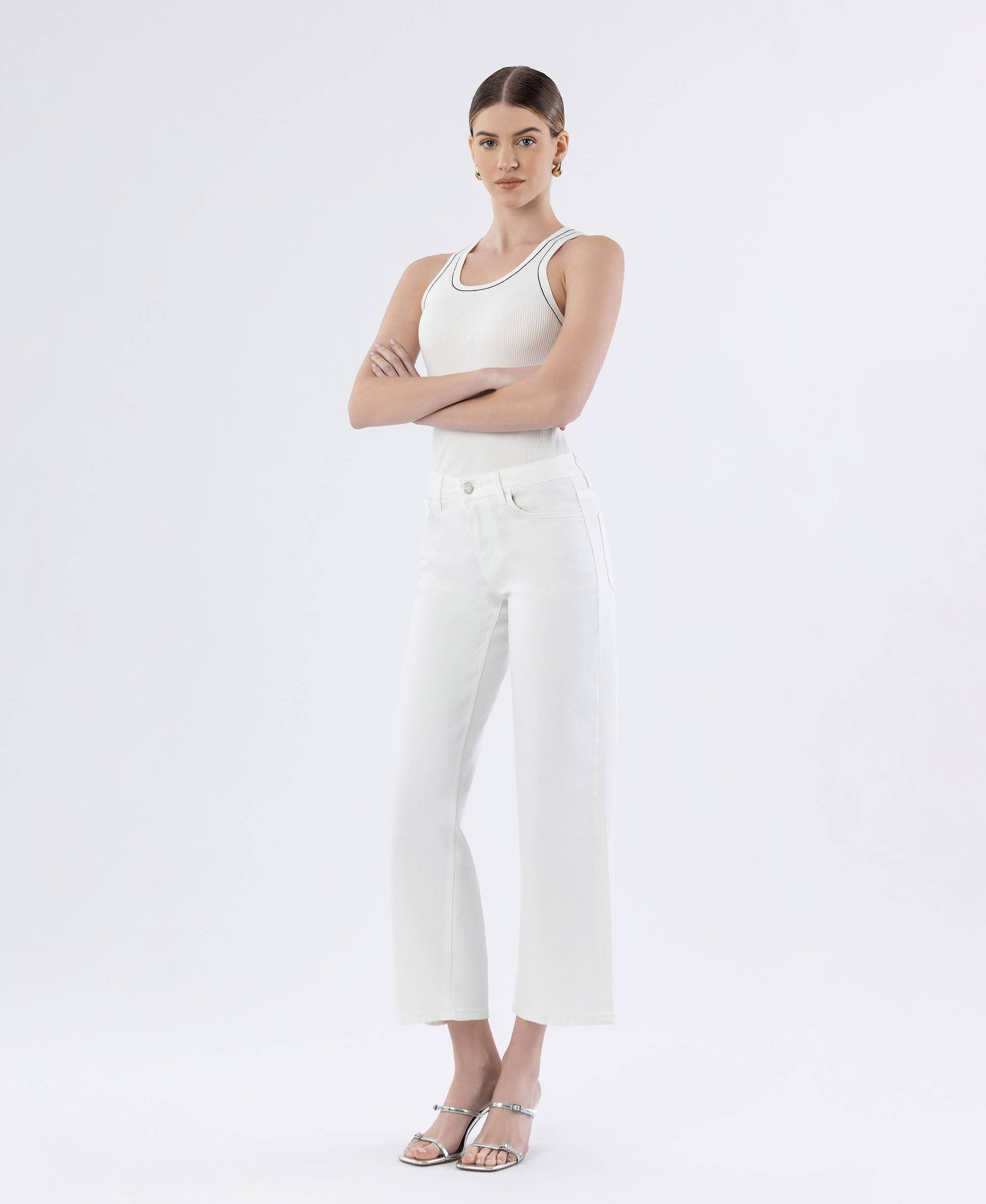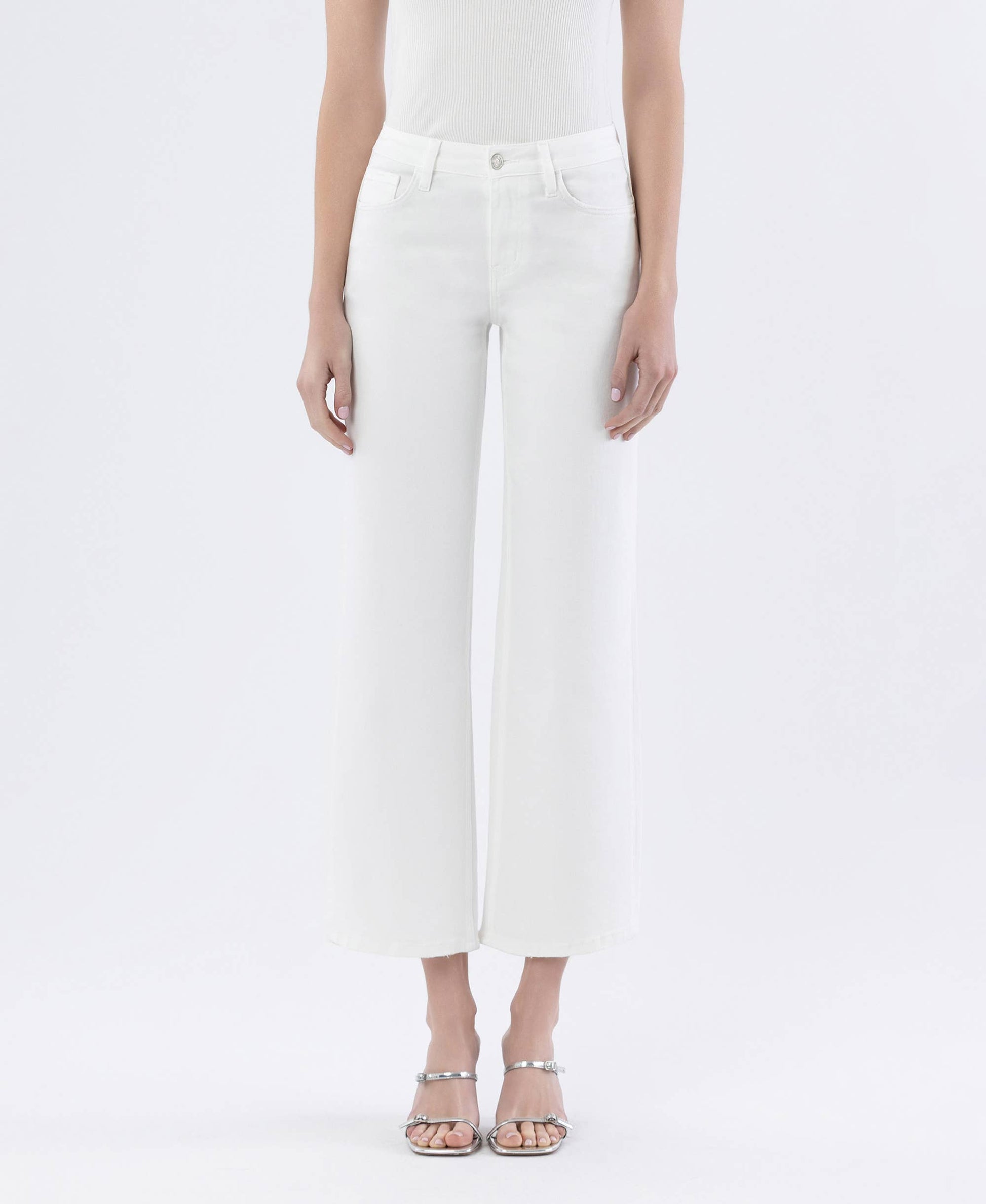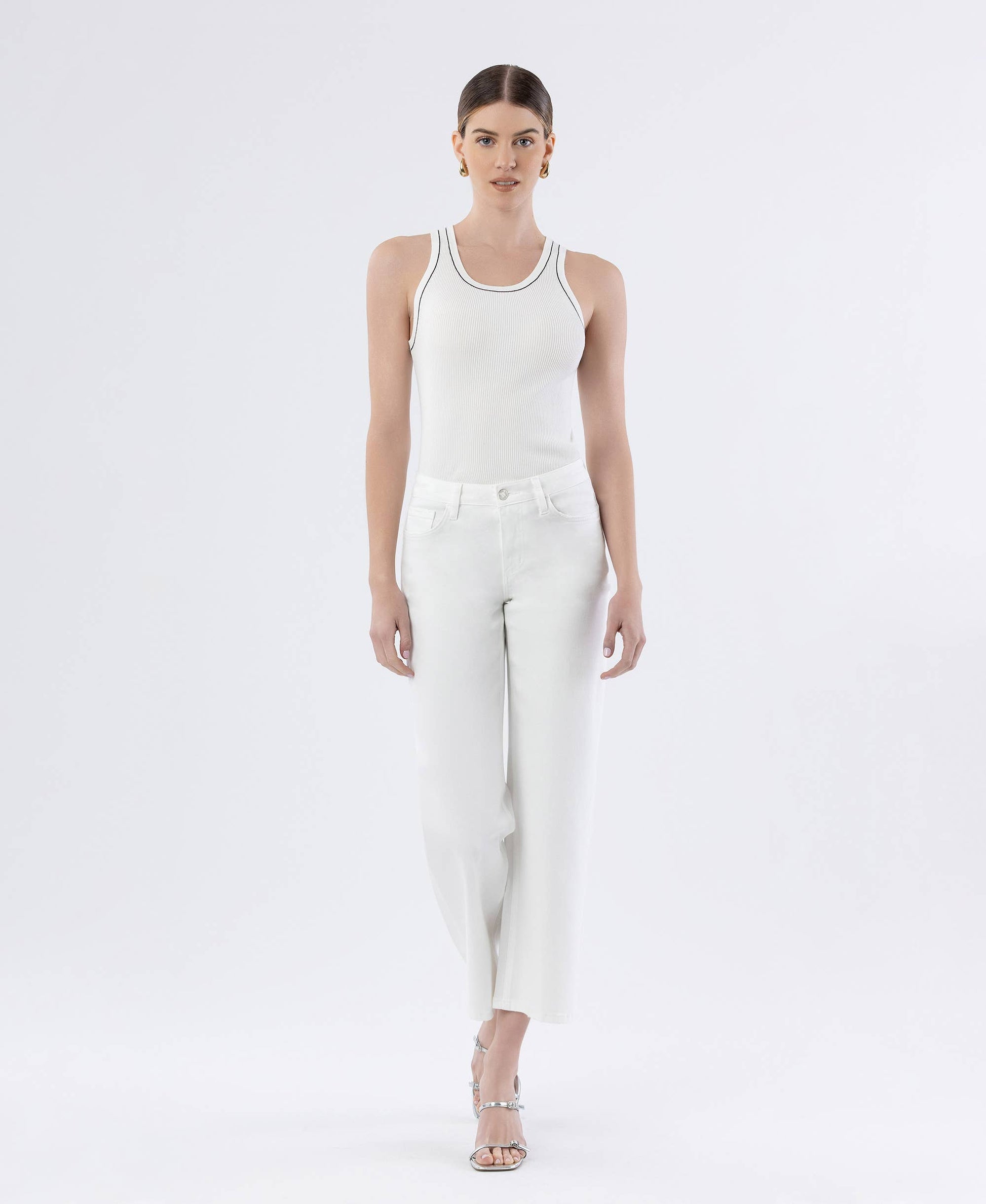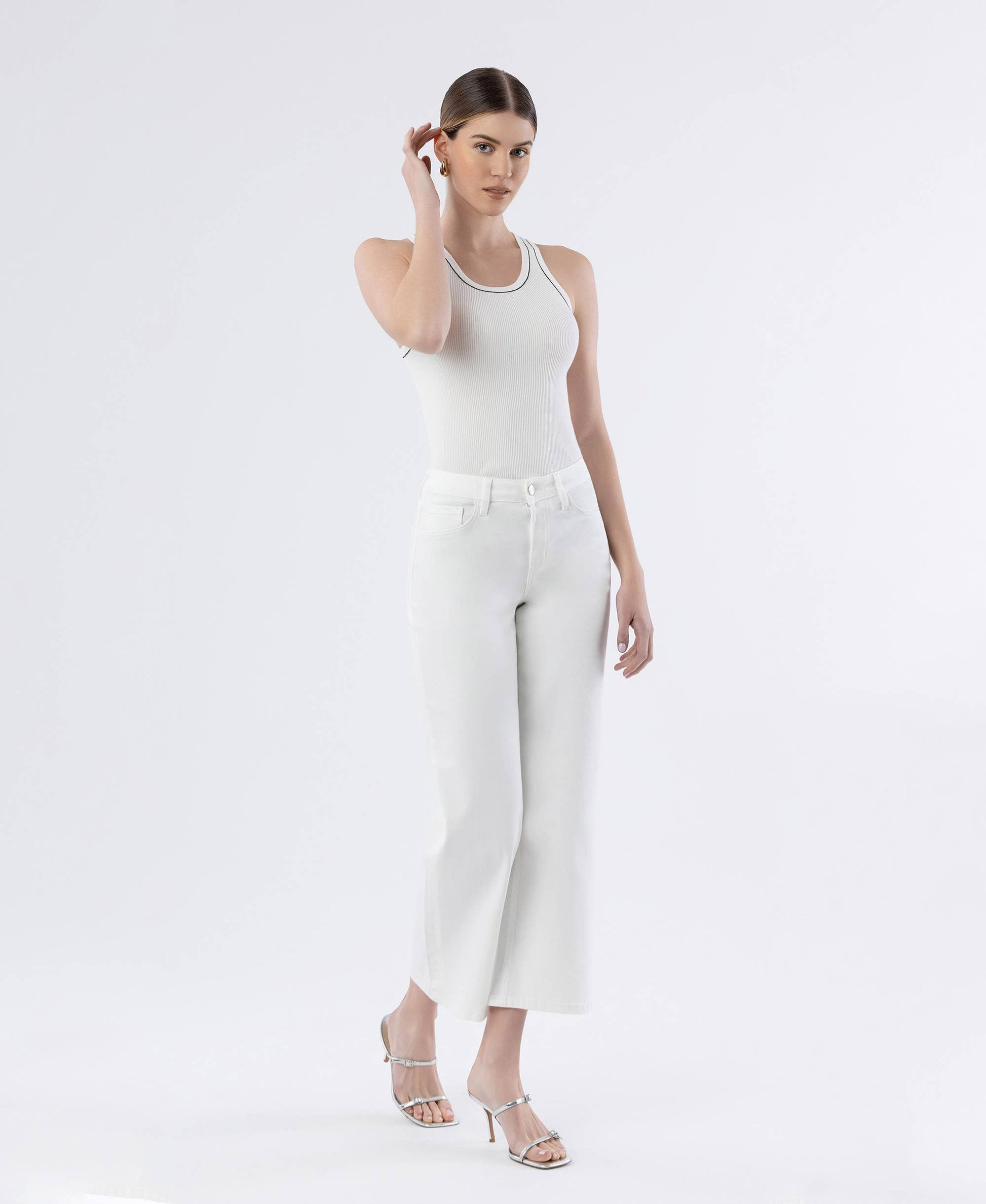 COMFORT STRETCH DENIM, MID RISE WAIST, FINISHED HEM, ANKLE LENGTH, WIDE LEG JEANS