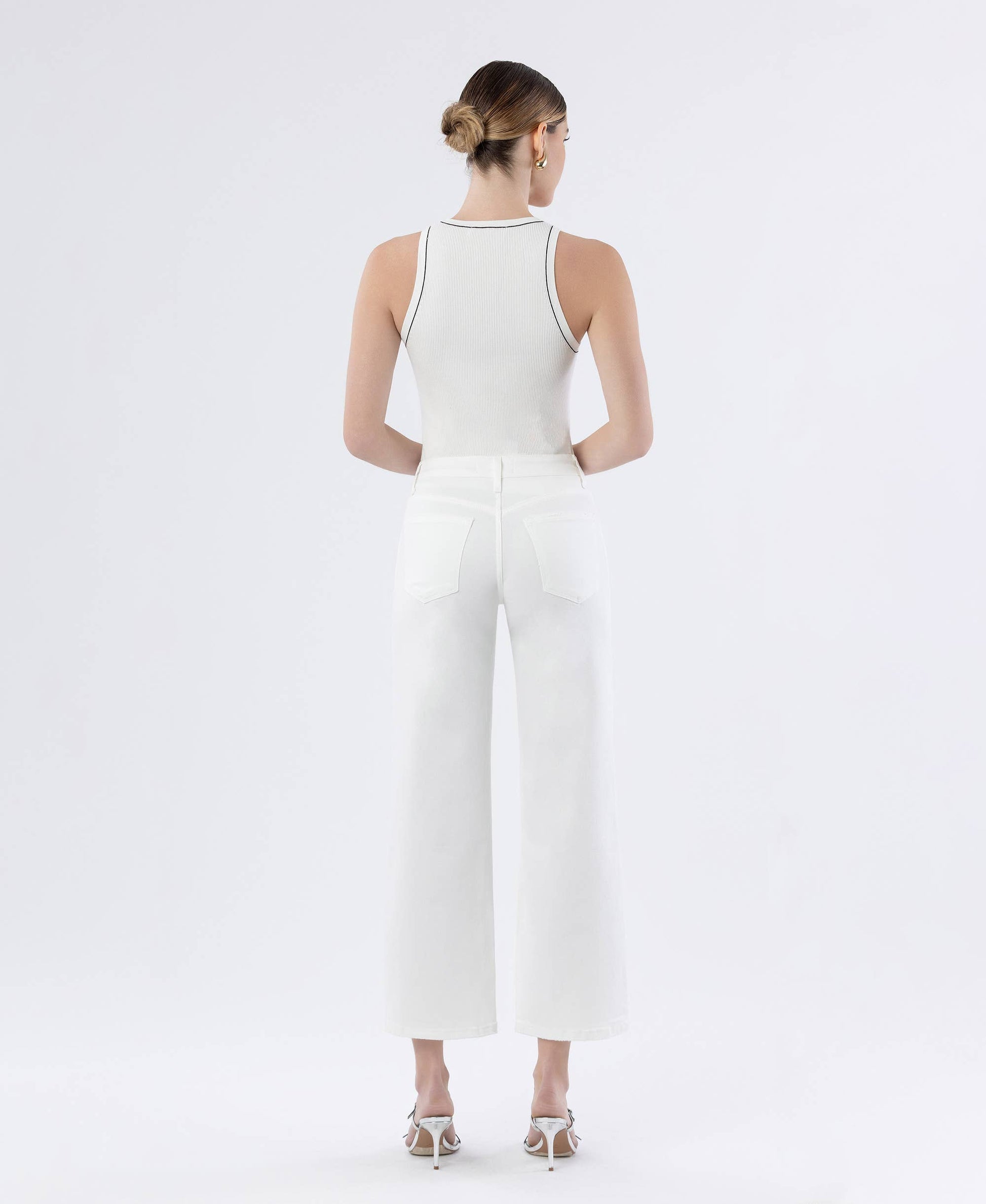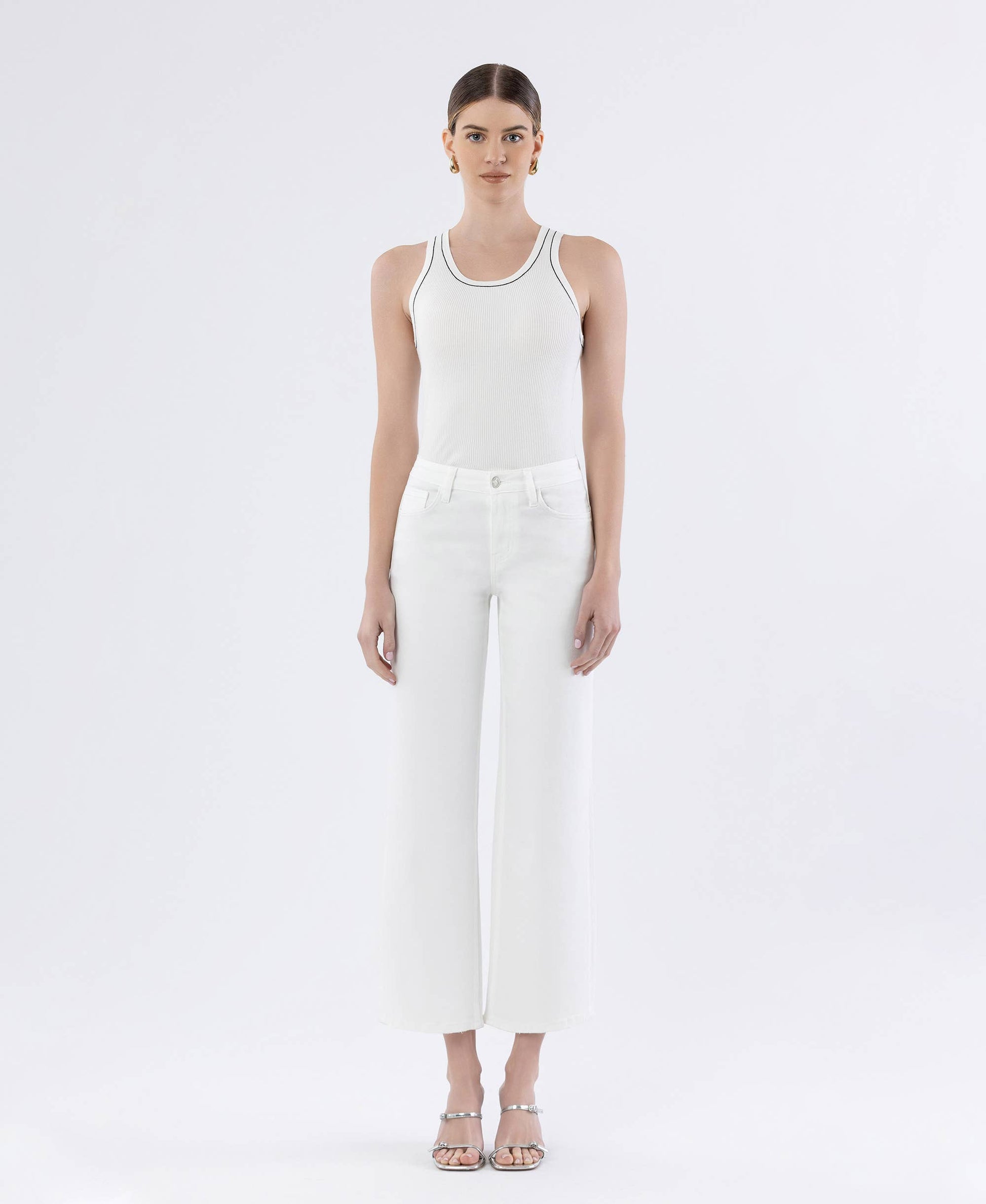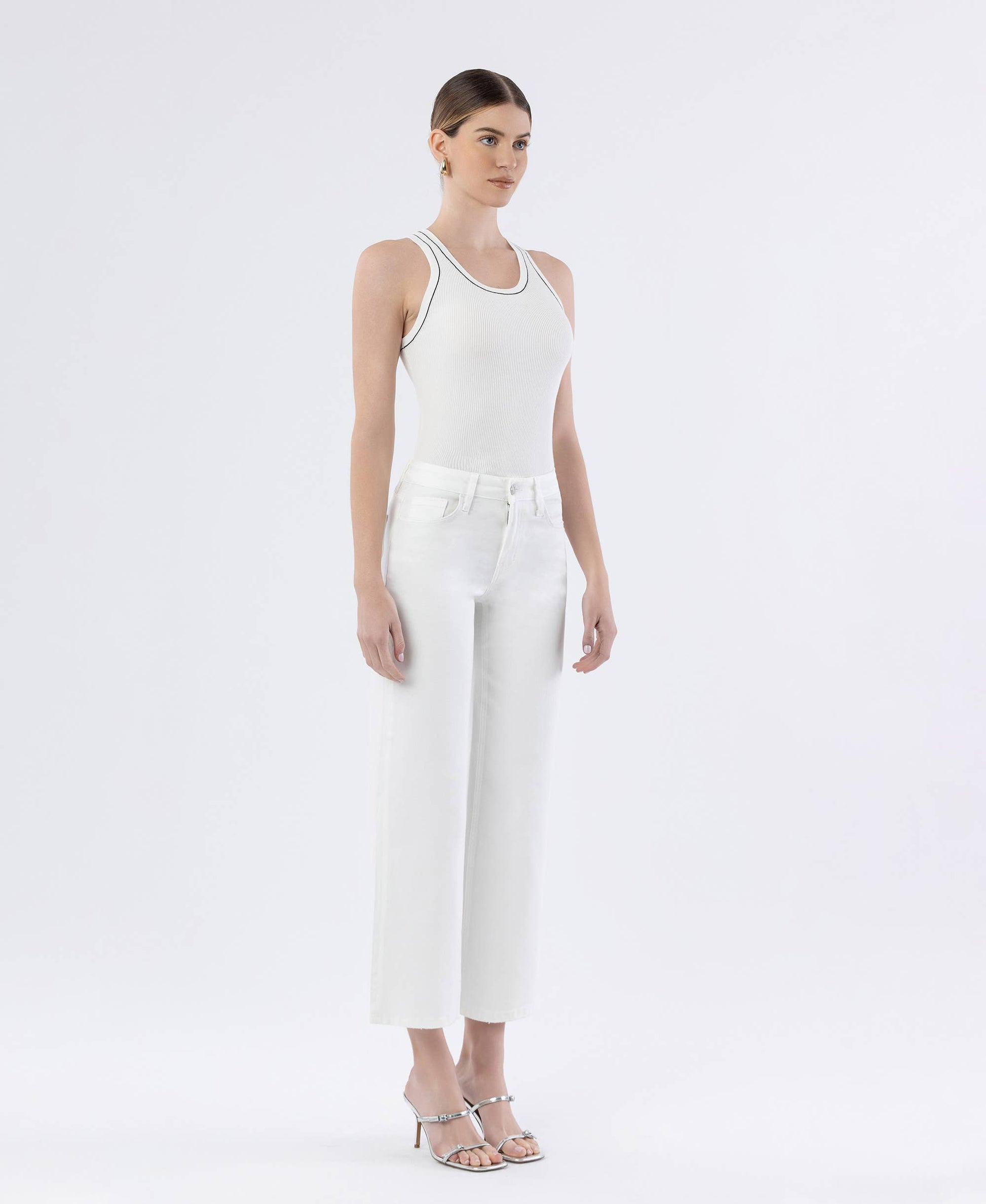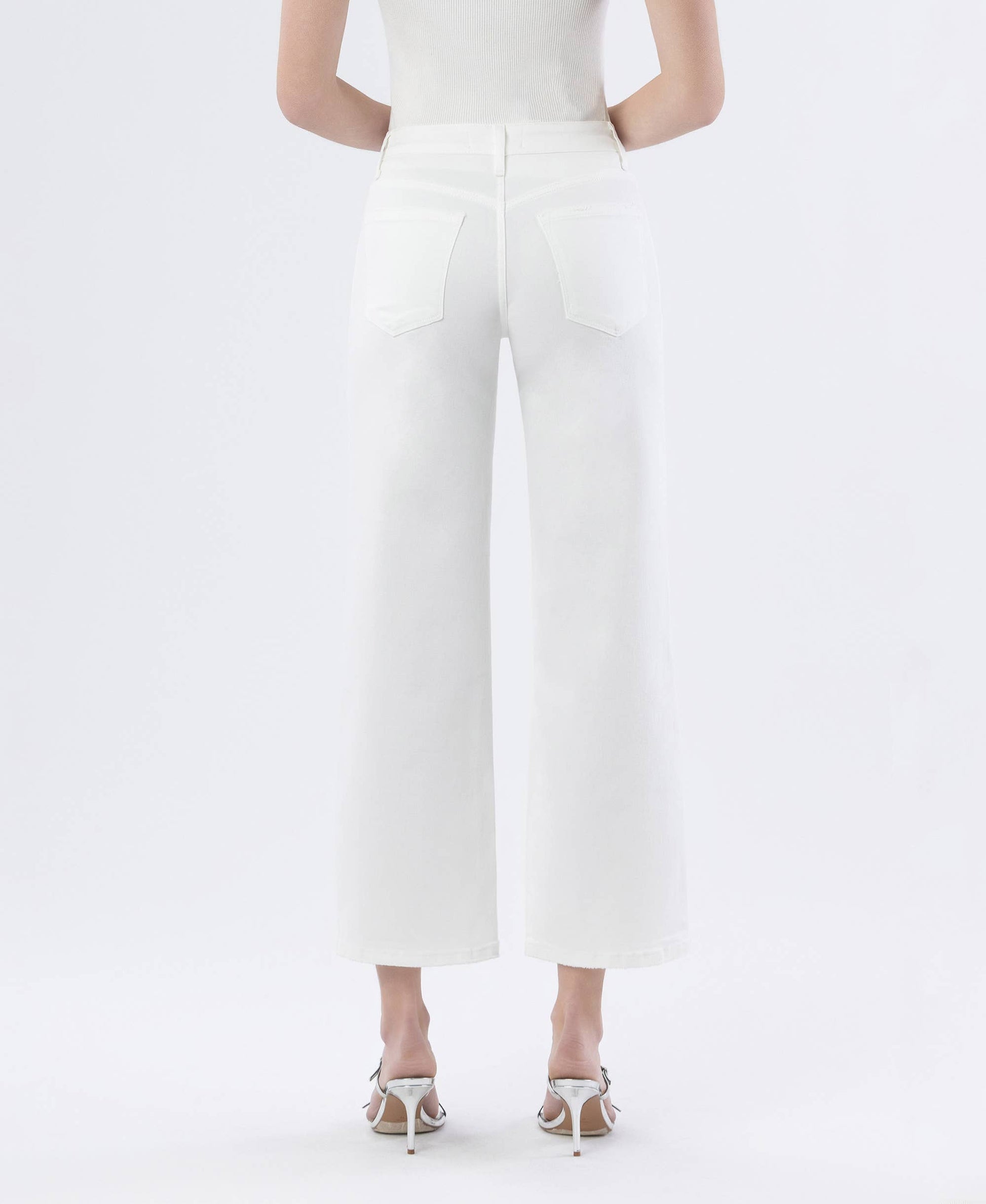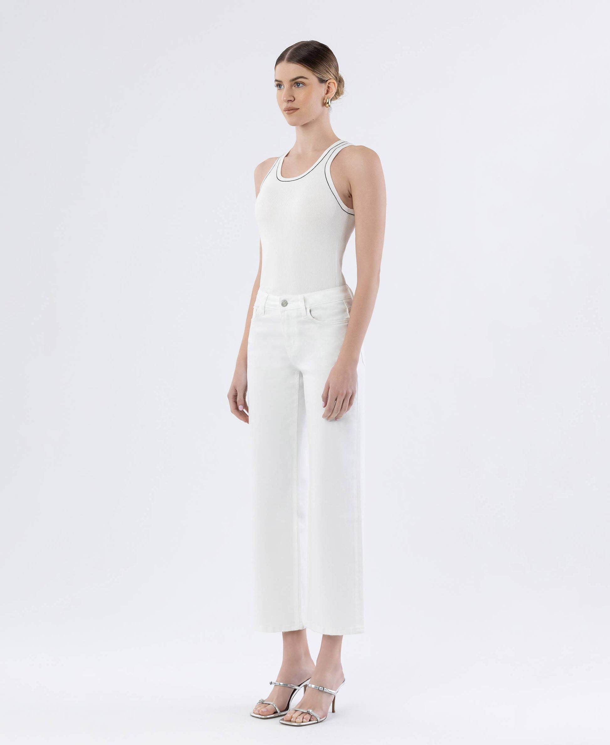 COMFORT STRETCH DENIM, MID RISE WAIST, FINISHED HEM, ANKLE LENGTH, WIDE LEG JEANS