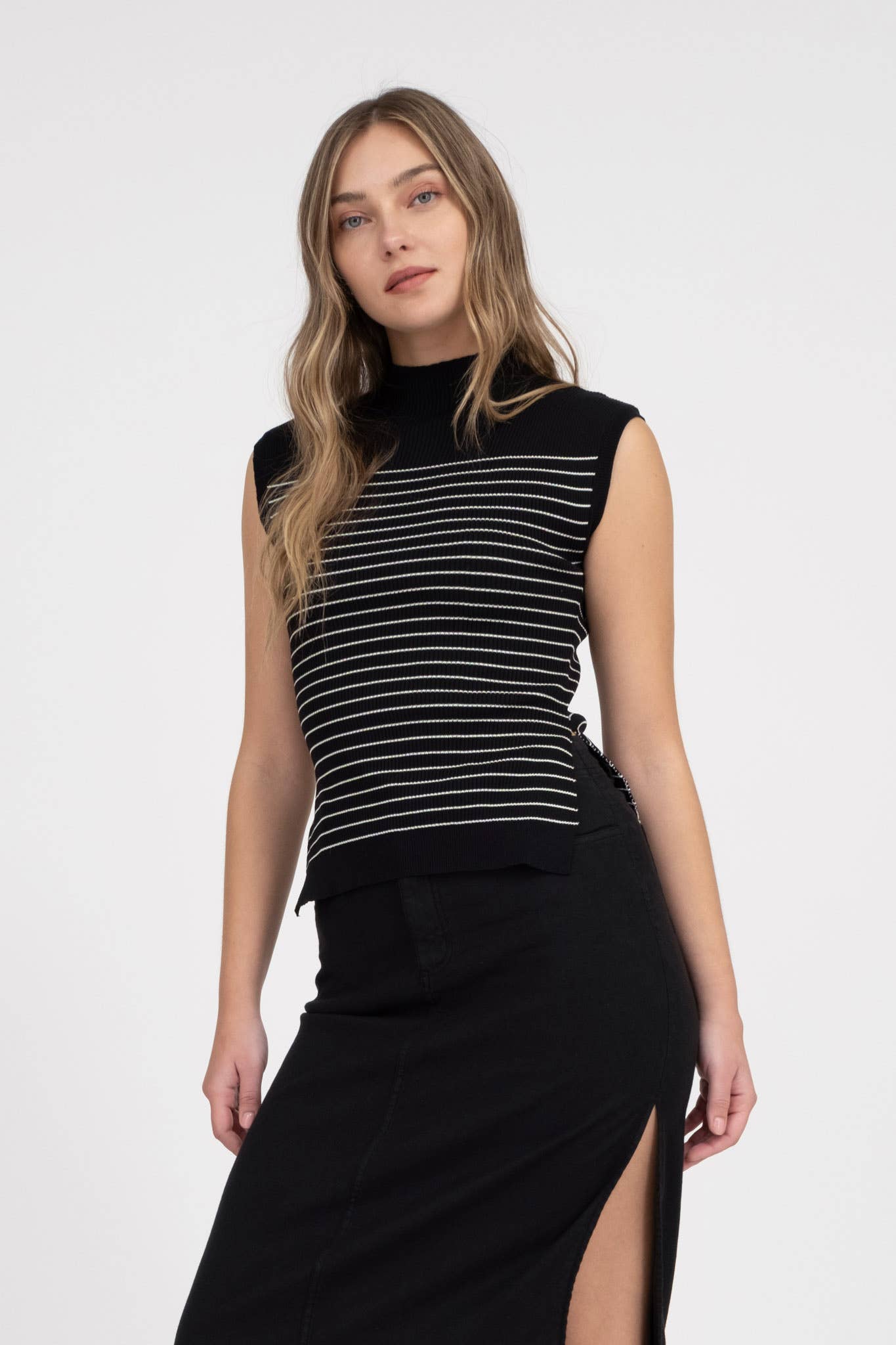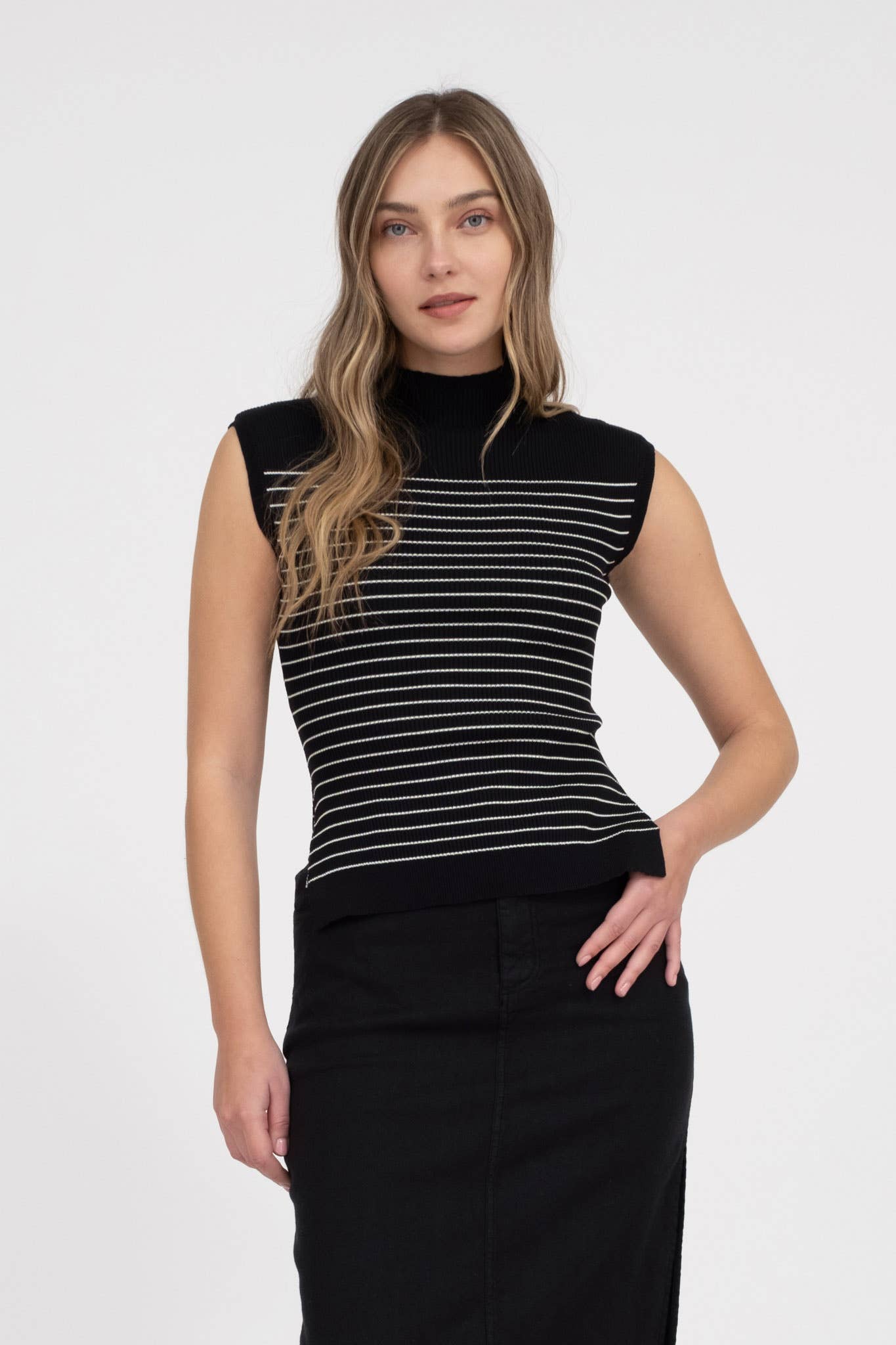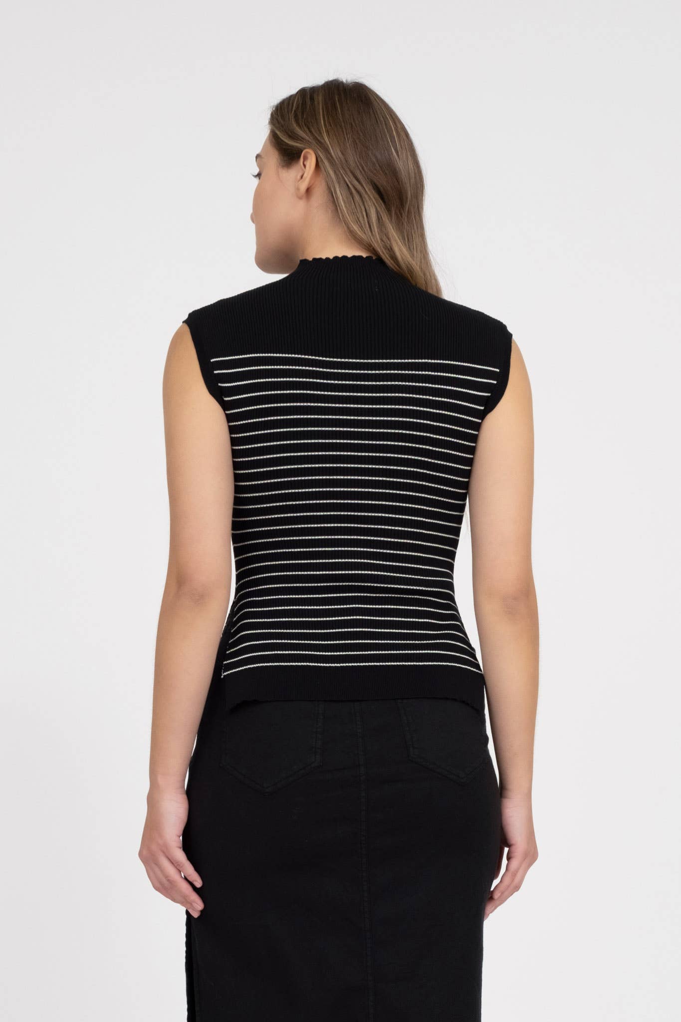 TW1788 2 SMALL 2 MEDIUM 2 LARGE MOCK NECKLINE SLEEVELESS STRIPE PATTERN SWEATER KNIT PULLOVER 70% VISCOSE, 30% POLYESTER