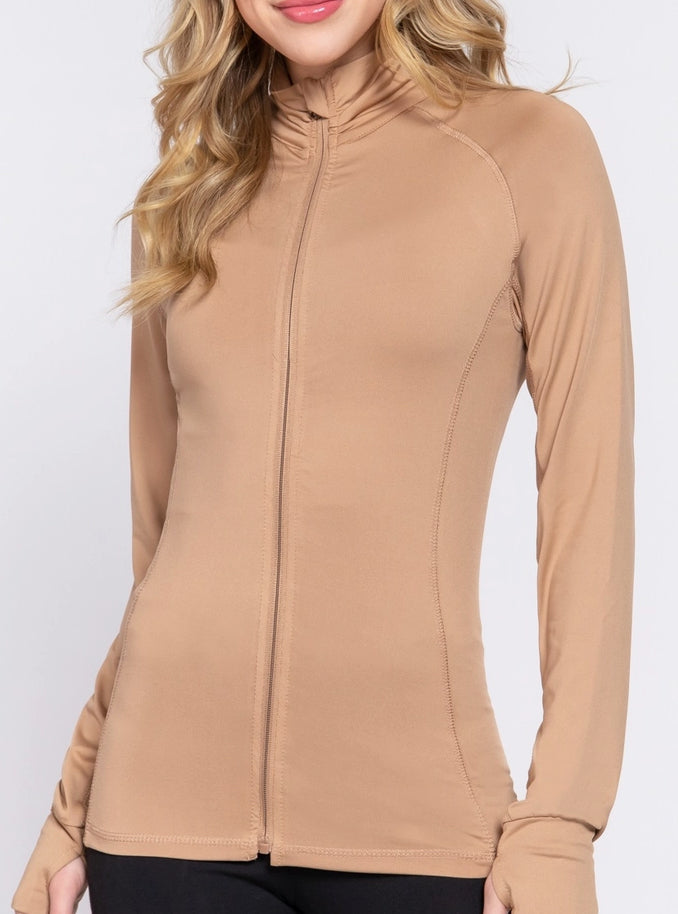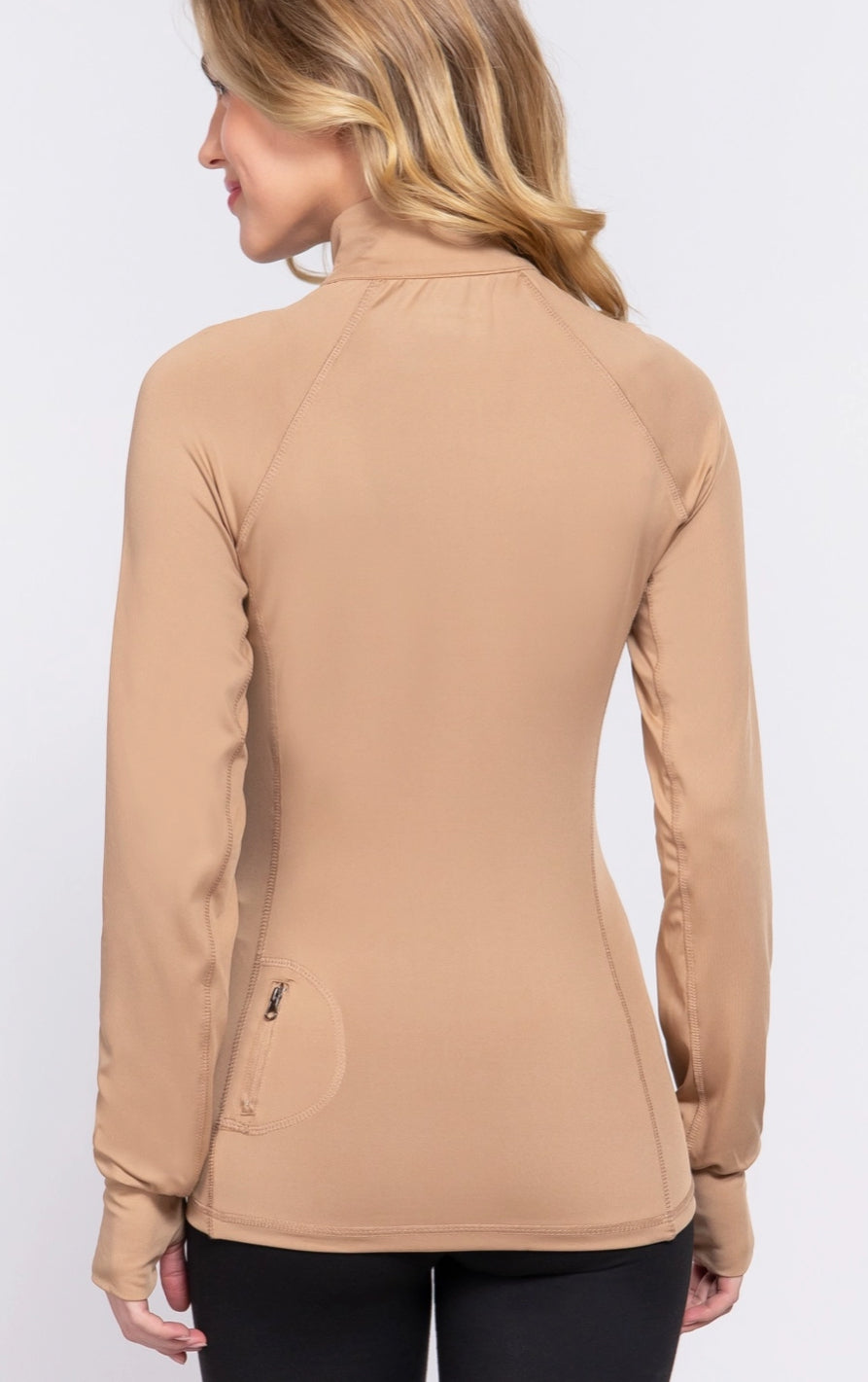 This is the shaper for active ladies. This will form to your body, but not feel tight. Lightweight full-zip with a pocket in the rear for cash and keys. This is the perfect yoga class zip up or on the boat to keep sun off your shoulders. Thumb holes for winter layering